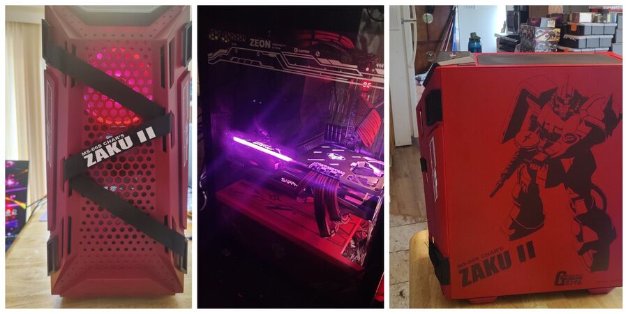 The PC under it is of my own design, based on Zakus from the Gundam franchise. I put too much effort in it being a Team Red all-AMD build with some custom cables and RGB fans to simulate the mech’s eye.