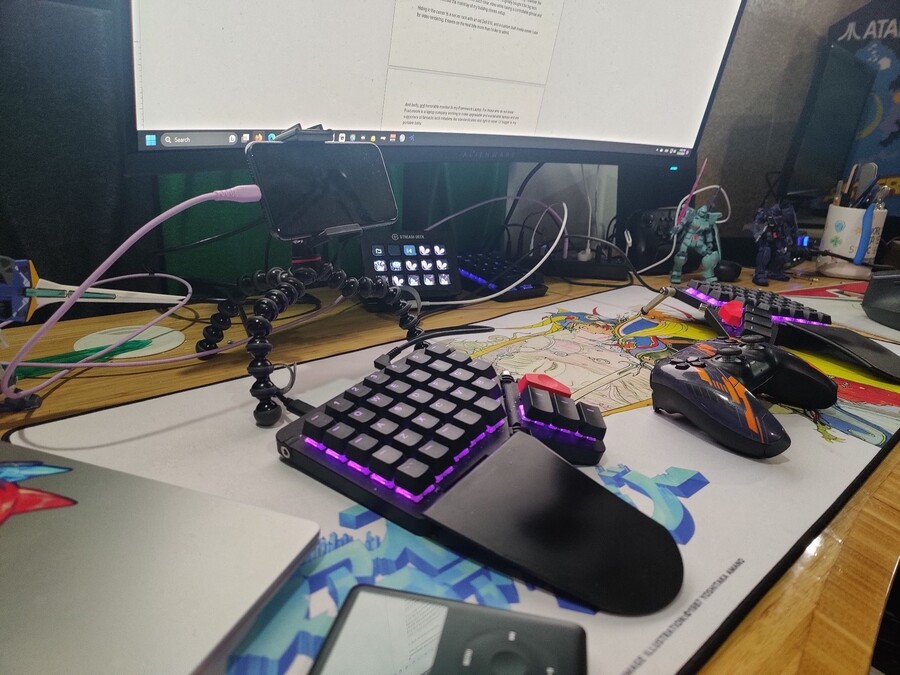 Add in my Moonlander, Stream Deck, audio interface, and iPhone X, and you got all the peripherals I use on a daily basis. Sprinkle in dual ultrawide monitors for large multimedia production space, and that's about it.