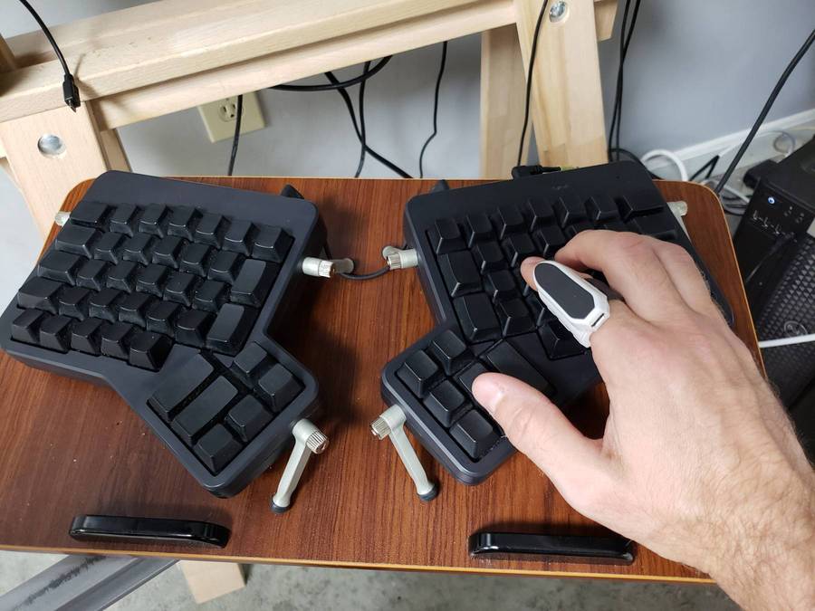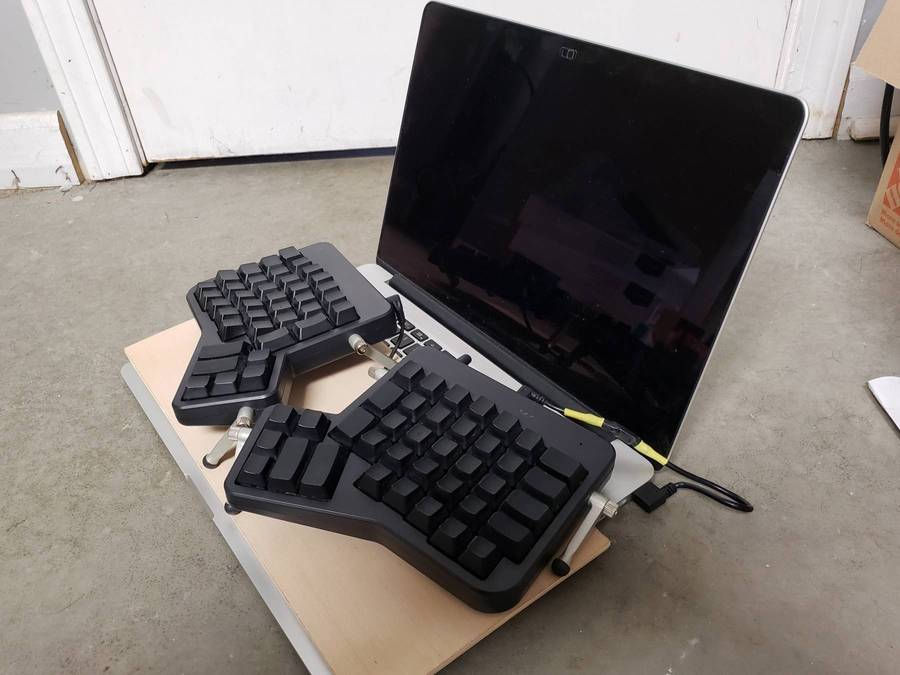 My Ergodox EZ goes with me everywhere. I fabricated a portable laptop stand for when I travel, and part of that doubles as a tray that sits on top of my laptop keyboard. My cables are short to not get in the way, and I soldered a Nano USB Hub and the Mycestro dongle inline with the USB cable to preserve USB ports.