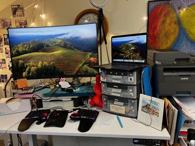 I have a MacBook Pro, and my office setup includes an Omni curved gaming monitor. I love the space a bigger monitor gives me to spread out. I use a ZSA Moonlander and a Kensington trackball mouse. I also have a Jarvis sit/stand desk. I have a Brother laser printer that I still use occasionally.