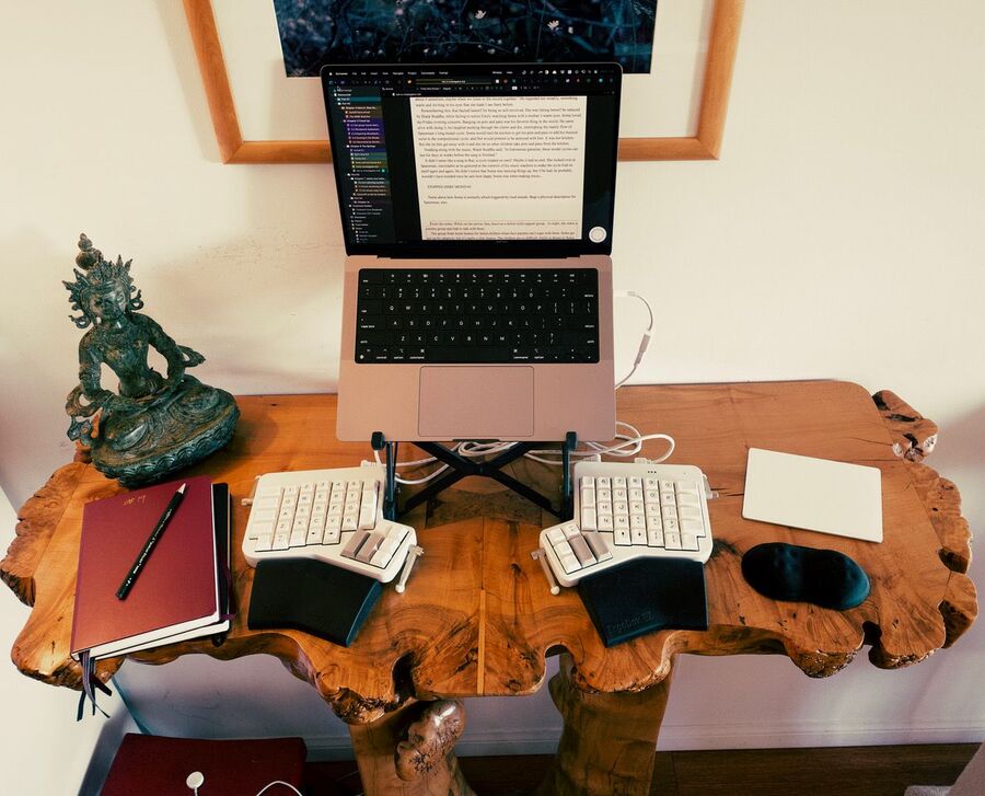 I’m pretty much working at my dream setup. I think about an additional, larger monitor sometimes, but using my iPad as a second monitor works well. My setup, even with the split keyboard, fits well at my standing desk. (It’s actually not a desk. It’s a bar that my mother made of fallen trees.)