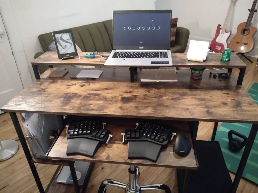 I use a black ErgoDox EZ with Cherry MX Brown switches, tilt kit, and wings. This stays out of sight on the desk tray. I practice touch typing to fully appreciate the ErgoDox. I learned through the TypingClub. For a few months, I would do a couple of lessons per day to build up muscle memory.