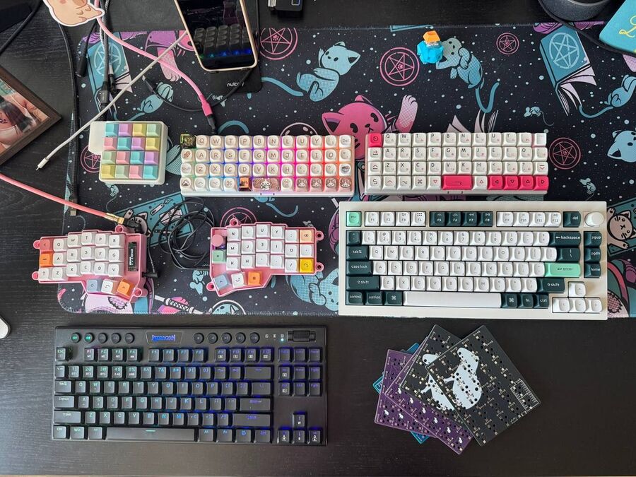 Keyboards in the picture: ZSA Planck EZ (two of them!), Corne v4, Keychron Q1 HE, and Redragon K621. Also in the picture: a 16-key macropad and a few prototype PCBs for something I'm slowly bringing to life as a passion project.