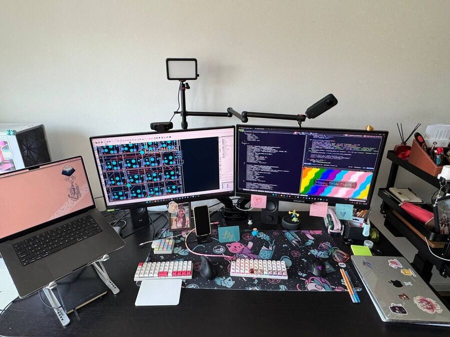 Two Planck EZs make my typing smooth and comfy every day, and I use a Logitech Lift mouse and a Razer Basilisk V3. I use an Elgato Key Light Mini for meetings and videos. I also have an Insta360 X3 camera sitting on the extended arm, though I mostly use it when I go skiing.