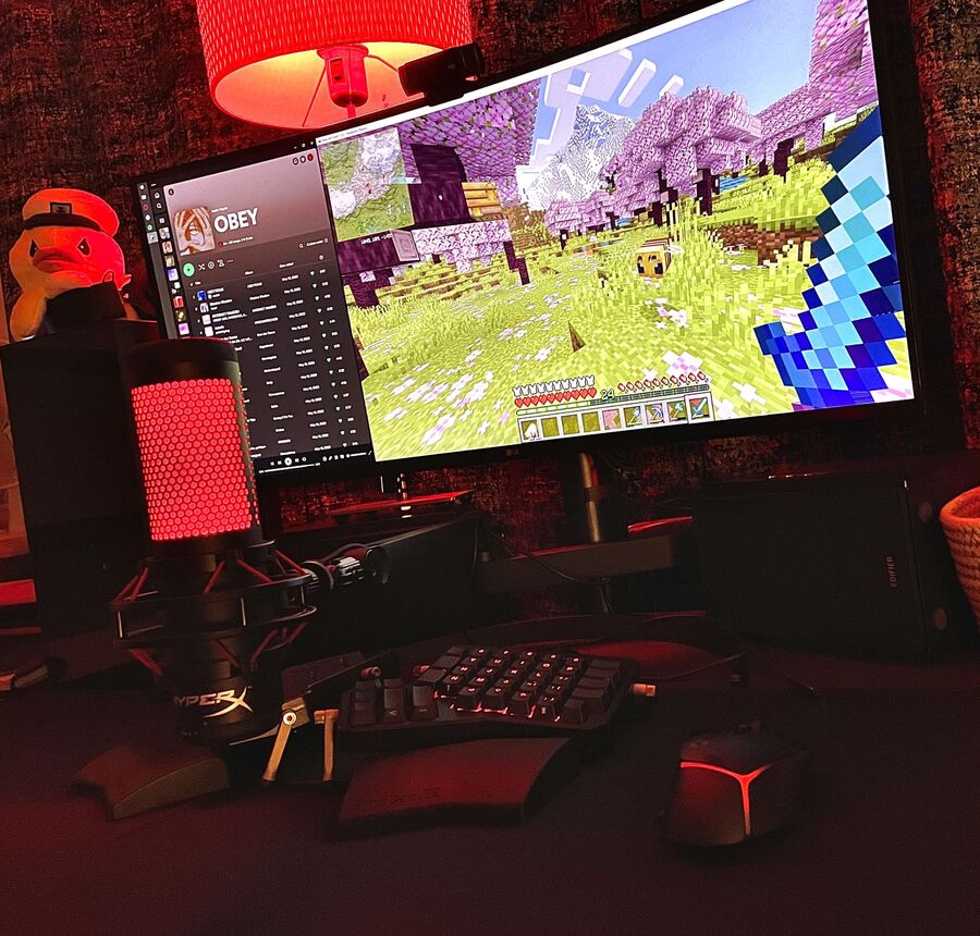 On my desk, you'll find two enormous mousepads from KRUX, an ErgoDox EZ with thick gold switches, and a Logitech G502 X mouse. For voice calls, I rely on the HyperX QuadCast mounted on an Elgato Wave Mic Arm, and a Logitech C920 cam. My monitor of choice is the UltraWide LG 34WP75C. For audio, I picked Edifier R1700BT speakers with SPC Gear Viro headphones.
