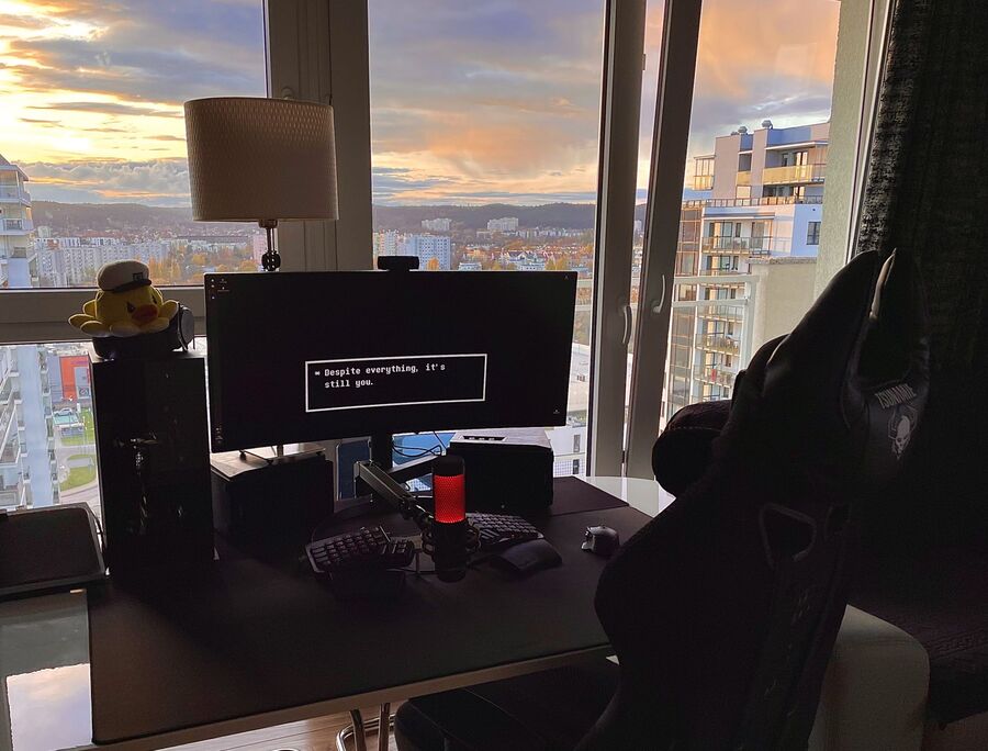 I'm a big fan of clutter-free workspaces, opting for an all-black theme with red accents on my main setup. My home PC is an RX 6800 XT with Ryzen 5 7600X, housed in a neatly packed mini ITX NZXT H1 V2. Building it from scratch was my first venture into PC building, aiming for a compact, minimalist design without compromising power. It was an overwhelming but thrilling adventure!