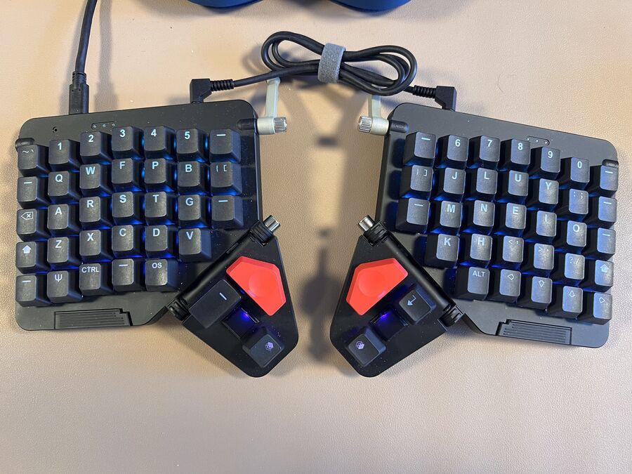Since the introduction of the Zip Kit (Thanks, Ben, for giving Erez the nudge here!), my Moonlander now has the edge I've always wanted it to have. The extra keycaps and the wing gap fill pieces are wicked. I've yet to start losing keys, but I think I know what I need to start losing for efficiency and optimisation next. I sometimes keep the wings on when I'm using my desk in standing mode, but most days I take them off to stop myself from relying on them too much.