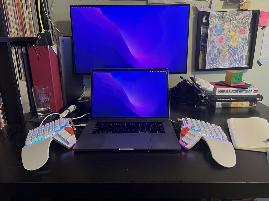 I used to be a die-hard PC user, but got burned out with decision fatigue a decade ago with all the components and choices I had to make whenever I needed to build a new rig, so now I'm on a MacBook Pro. I have it set up where I have the MacBook hooked up to an external monitor as a second screen, and the two halves of my keyboard on either side of the laptop keyboard. I use the touchpad on the laptop to move the cursor.