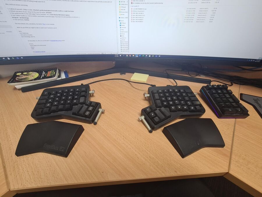 I use a black ErgoDox EZ with a tilt/tent kit. Knowing that I share my office with a hot-desk user occasionally, I opted for the Cherry MX Clear when I ordered the keyboard from ZSA. I also added the Wings, as I had a lot of trouble with my wrists with my old keyboard being a bit low with my seating position. I haven't played around with custom keycaps (yet) but at some point I will do! I have spent the last year or so getting used to the newer layout with vertical keys.