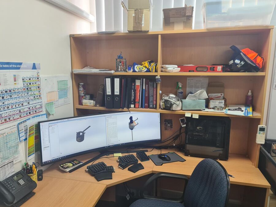 My work PC is a water-cooled Intel I5 9600KF with Quadro P1000 and 32GB ram. I also use a pair of Cambridge Audio Melomania in-ear headphones to stream Spotify during my workday. Aside from my ErgoDox keyboard, I have a standalone numpad setup, and use a Logitech gaming mouse which has most of my SolidWorks shortcuts programmed into it.