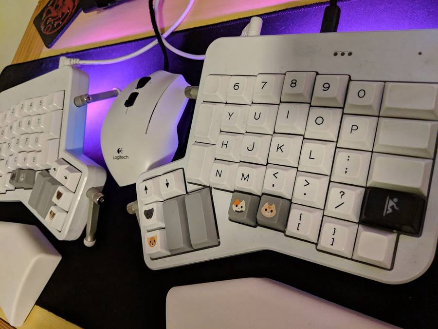 Of course! I initially bought my first ErgoDox to fight the symptoms of carpal tunnel, so the tilt kit and custom layout are a must to reduce strain on my hands and wrists. While my layout is mostly standard, I've moved a couple important keys like backspace and the brackets to more natural positions. I've also added an extra two layers with Function keys and media control to make debugging easier (and one-handed!). I use a couple of enthusiast keycaps, including eight cats and dogs and a set of Portal caps for my shift buttons.