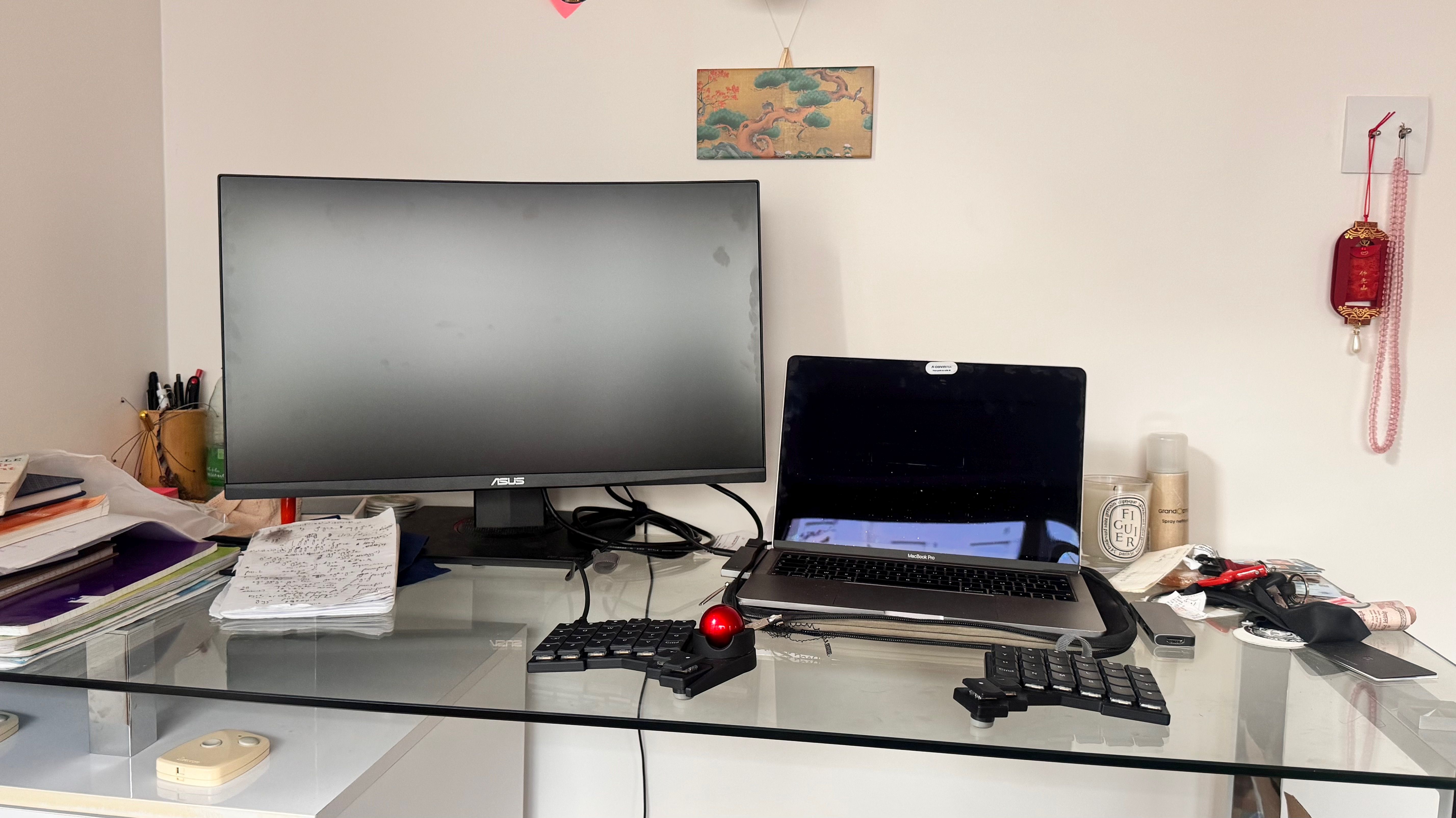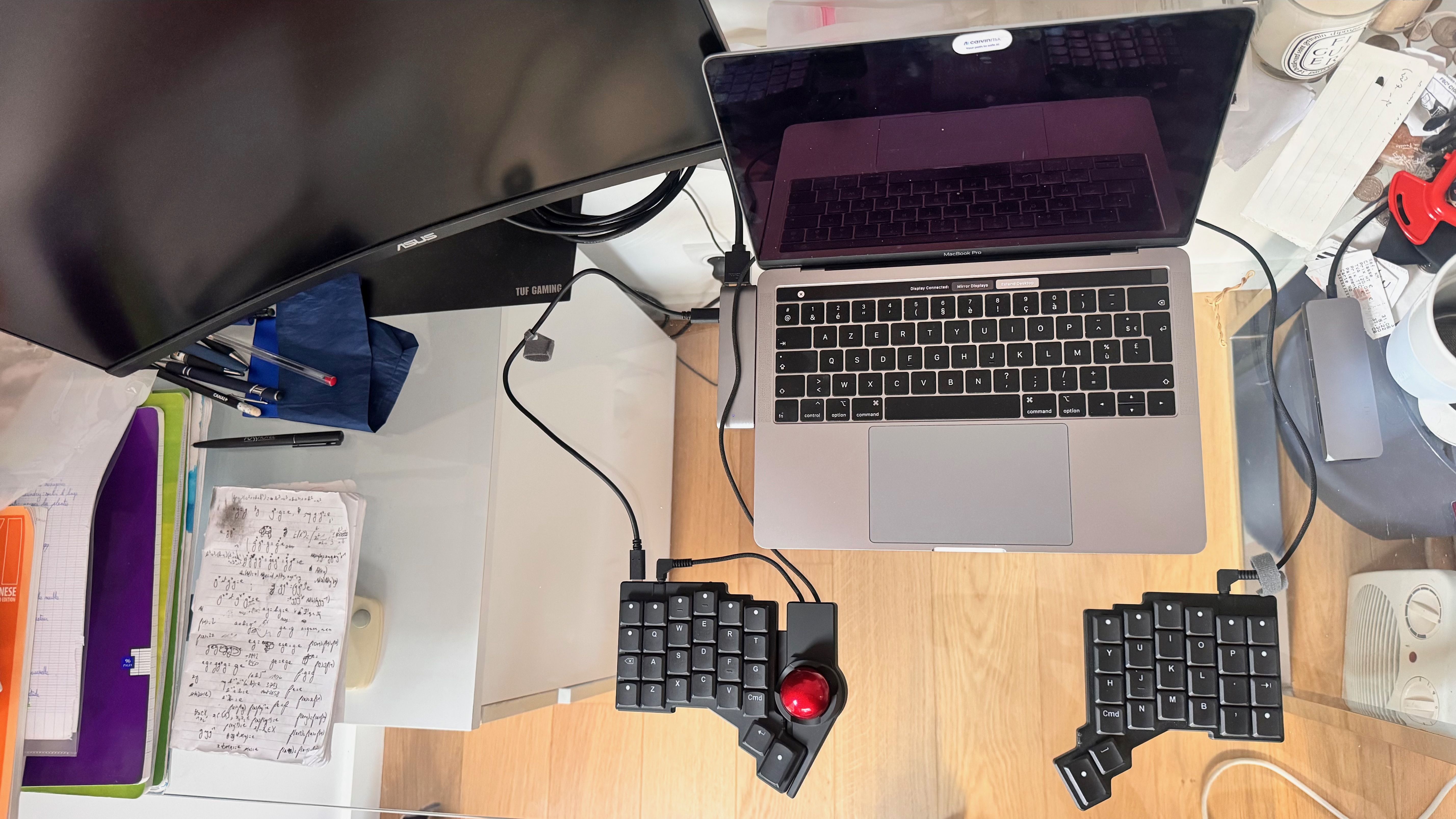 My machine is a 13-inch MacBook Pro (Intel Core i5) that travels everywhere with me. At home, I plug it into an Asus TUF Gaming VG24VQR—a monitor I inherited from my grandfather, since he no longer needed it. Whenever I have access to a proper desk, I also pair it with my ZSA Voyager topped with the ZSA trackball.