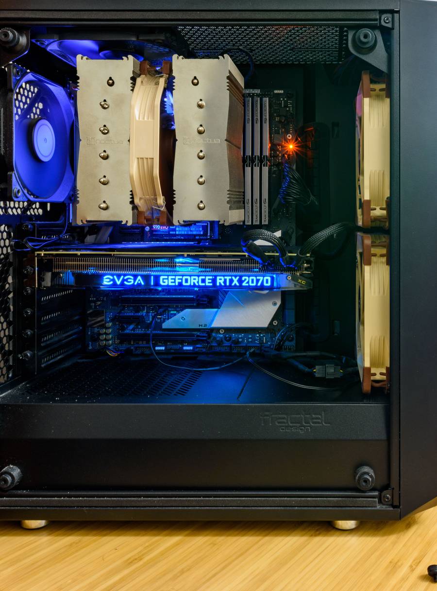 I have a custom-built PC on my desk—it has an i7-8700k, an RTX 2070, 32 GB of RAM, and a bunch of NVMe and HDD space, cooled with some big Noctua fans and a heatsink, all inside of a Fractal Meshify C case. I built the system a while back, and it has held up well. Those Noctua fans do a fantastic job of keeping it running smoothly. In addition to working, I occasionally play video games on the computer, and they render beautifully.