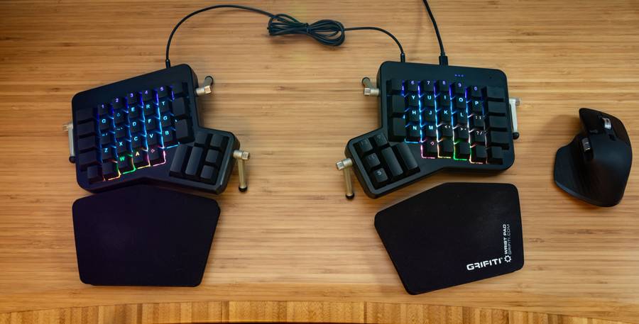 I use an ErgoDox EZ as my keyboard and finally upgraded from a little travel mouse to a Logitech MX Master 3 mouse.
