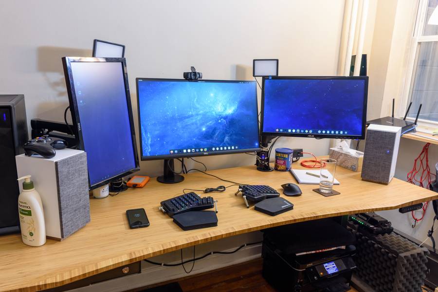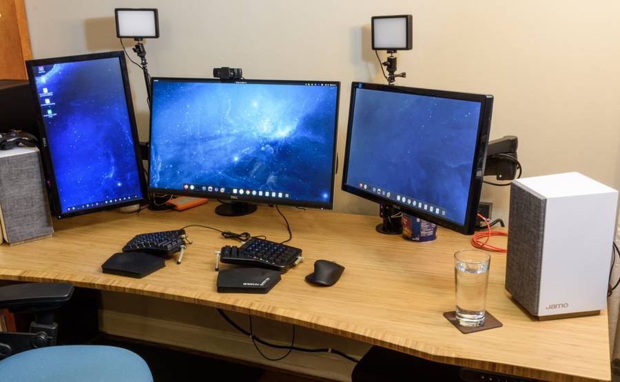 I have a long 80” Uplift sit/stand desk in bamboo with industrial-looking metal legs. On top of the desk, I have three totally mismatched monitors. The one in the middle is a newer 4K Dell S2721Q. It is amazing how much of a difference the bigger 4K screen has made to my work. I can actually see the text on the screen, and I am taking way longer to fatigue. I also have two Jamo speakers, which are a bit large for a desk, but I really enjoy listening to music while I work. All three monitors are on articulating arms, which allows me to transition from sitting to standing quickly and keep a decluttered desk.