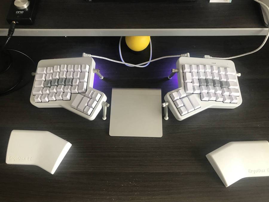 Soon after ordering it, I really badly broke my left hand. After months of rehabilitation without being able to type on any keyboard, I quickly felt comfortable on the ErgoDox EZ. I have to use my old keyboard from time to time, a TypeMatrix. It's pretty good, but it hurts really quickly since remapping is pretty limited, and switches that are not mechanical are harder to activate.