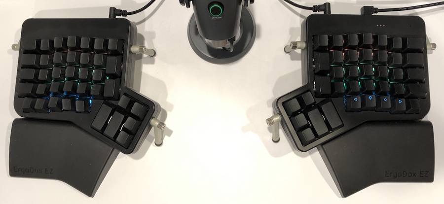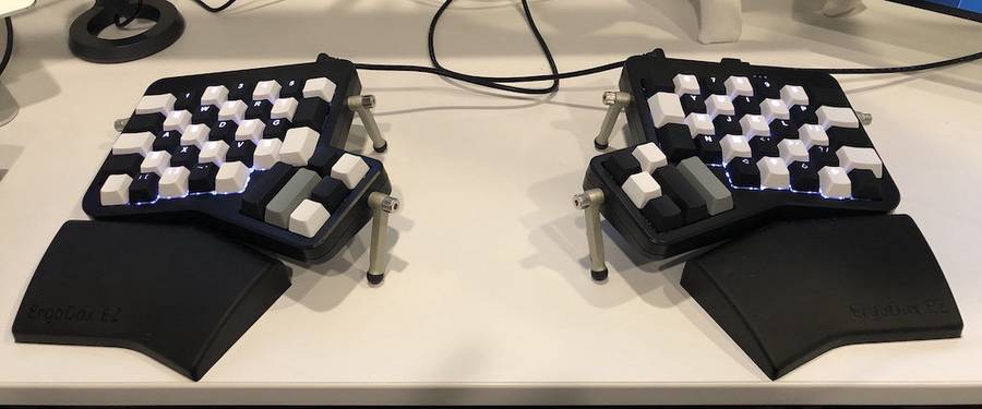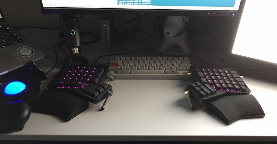 But mild carpal tunnel and RSI symptoms prompted me to research ergonomic options, ultimately choosing the ErgoDox EZ for its split profile, build quality, and QMK firmware. Mine is the black Glow with Kailh Copper speed switches. The Kailh Coppers are relatively quiet and light with a short actuation point, a typing joy.