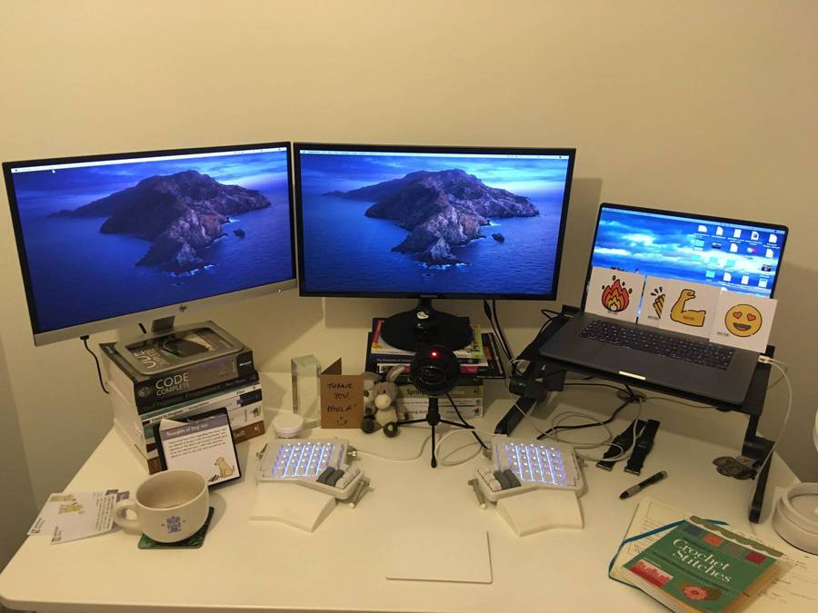 Although I started writing code on a Windows machine, I switched to Mac pretty soon and have been a happy Mac user for a few years now. I have a 16" MacBook Pro for work and a MacBook Air for personal use—and also an iPad Pro and Apple Pencil for reading music! I love my Apple Magic Trackpad, as traditional mice often give me wrist pain. And then of course I have my fabulous ErgoDox with wrist supports.