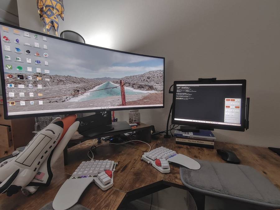 The fantastical dream setup involves more laziness. Something like a hanging monitor on my bed with a split keyboard laid on either side for each of my hands, one feature down, one more to go! Or something like an Altwork station with side arms to sit the Moonlander on.
