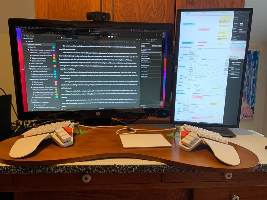 I always want more monitor space. Maybe it's my eyes, which, alas, are nearly fifty, but I often refer to two or three documents and web pages as I write. Right now I have a landscape-oriented 27" and a smaller portrait-oriented one, both of which are several years old. My next upgrade will probably be a bigger monitor. I do a little photography and attendant photo editing, so I'd love a superwide with high resolution and good color accuracy.