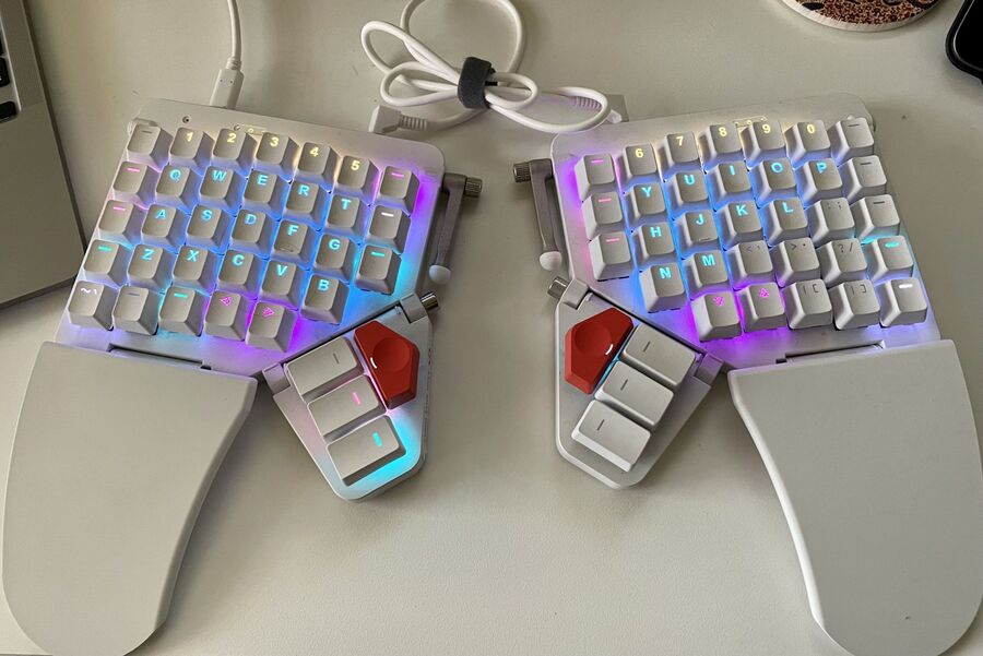 My keyboard is the white Moonlander with Kailh Silver switches. I wanted the switches with the lowest travel and least actuation force, and not too clicky. I have my own custom layout, which includes a lot of colour coding to help me group switches. Auto Shift is wonderful—so much so that I have great trouble typing uppercase letters or symbols on any other keyboard.