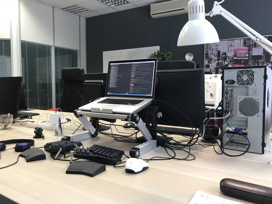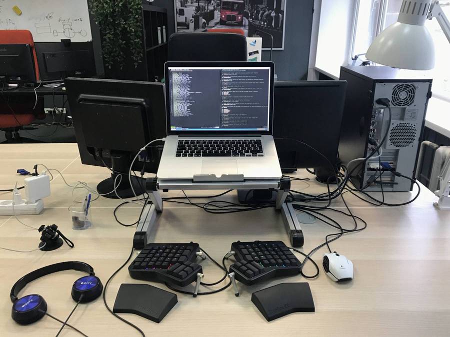 I travel a lot so I'm used to coding without any additional peripherals, but recently I started to spend more time in our office in Novosibirsk so decided to invest in a keyboard to improve my typing experience. I had been eyeing the ErgoDox EZ for almost a year, so I already knew what I wanted. I used my birthday money to get a black ErgoDox EZ Glow with Cherry MX Brown switches, Wing wrist rest, and Tilt/Tent Kit. It is my first mechanical keyboard and I am really enjoying it so far. I have a pretty simple setup which is currently "work in progress". I work on a 15-inch mid-2014 MacBook Pro placed on a laptop stand that I recently borrowed from a coworker. For a mouse, I use the Logitech G600. It has been with me for almost six years. I chose it because it feels very comfortable in my hand. I hadn't used it much after I got my MacBook, but now it sits on my work desk beside my new keyboard. There is also an ErgoDox Satellite Silent (fidgeting with it helps me to think) and some usual stuff like my iPhone 7, pens, papers, earphones, etc.