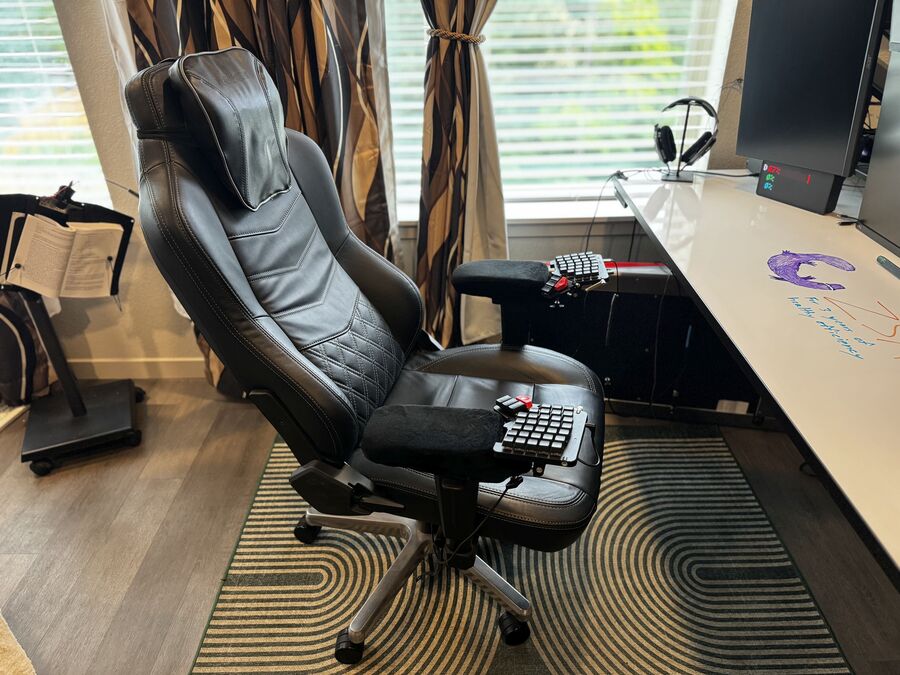 My friend Cole sent me a link about the Moonlander after he discovered it, and upon learning that it could be mounted to my chair arms, I had to try it. I had only used run-of-the-mill keyboards prior to this, but as I matured as a developer, I realized that in the same way the quality of my equipment is important for music, it's also important to have an ideal instrument for my computer.