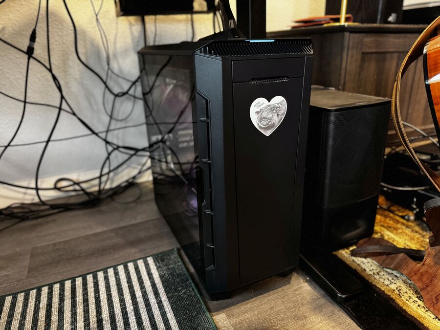 My main workstation computer is a desktop PC I built myself, nicknamed Moo Deng after the famous baby pygmy hippo who was viral at the time, and is similarly fast, thick, and dark grey. Conveniently, I had recently purchased a special edition Moo Deng: Full of Rage guitar distortion pedal from 1981 Inventions that came with a custom sticker I donned on the front of my PC case. This is the machine I primarily use my Moonlander on.