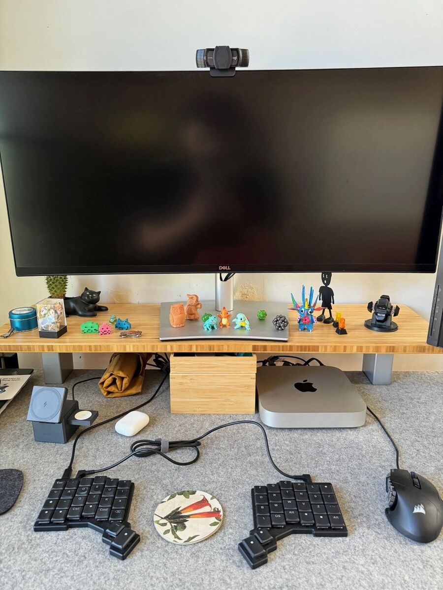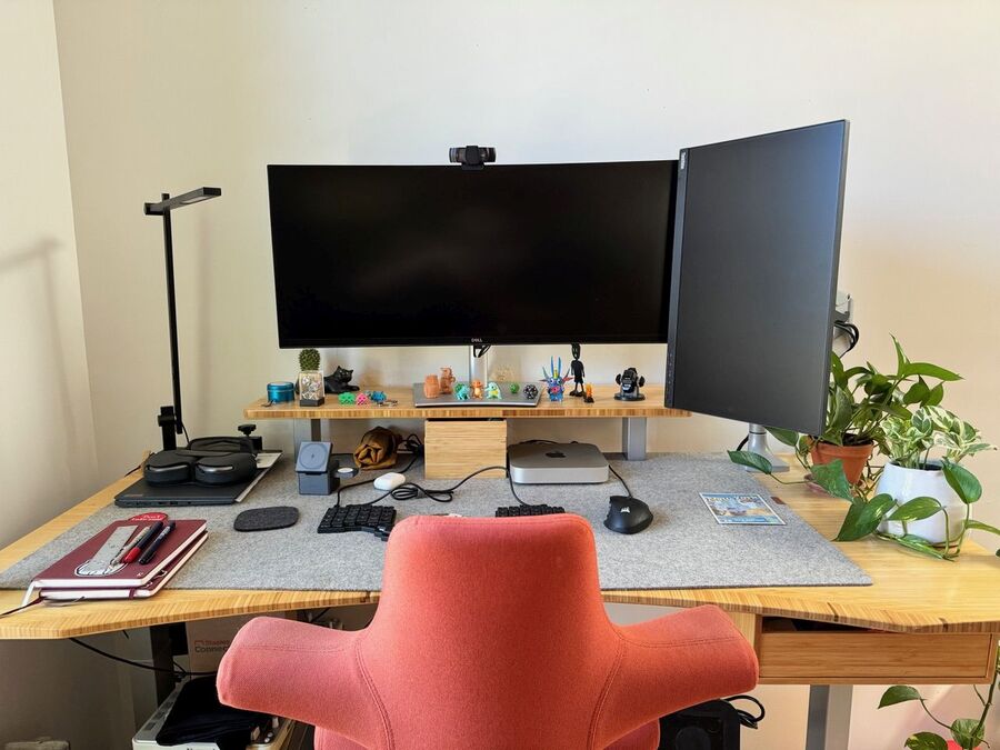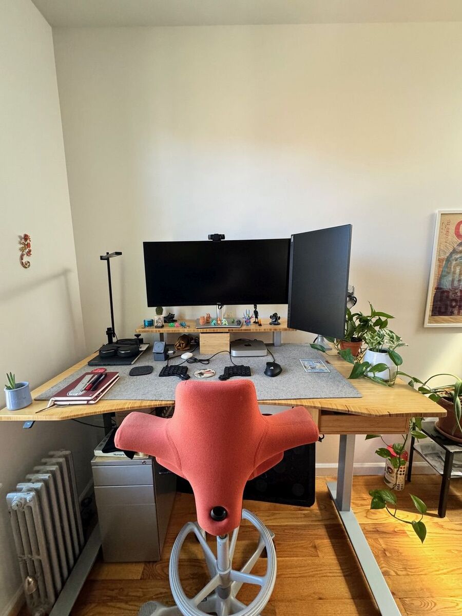 My desk is a standing desk by Fully, which unfortunately are not around anymore. I really like my chair, which is a HÅG Capisco. I bought both during a period of peak remote work in the pandemic, and they were a big but welcomed investment. I have a Mac mini M2 that I’ve used for a while and I have a work-issued 13” Lenovo ThinkPad. I have a 34” monitor, which changed my surface area so much (both physically and digitally), and my job gave me a 24” monitor that I have in a vertical angle. I have two mice, a Corsair for gaming and a very nice Swiftpoint mouse that I can take anywhere.