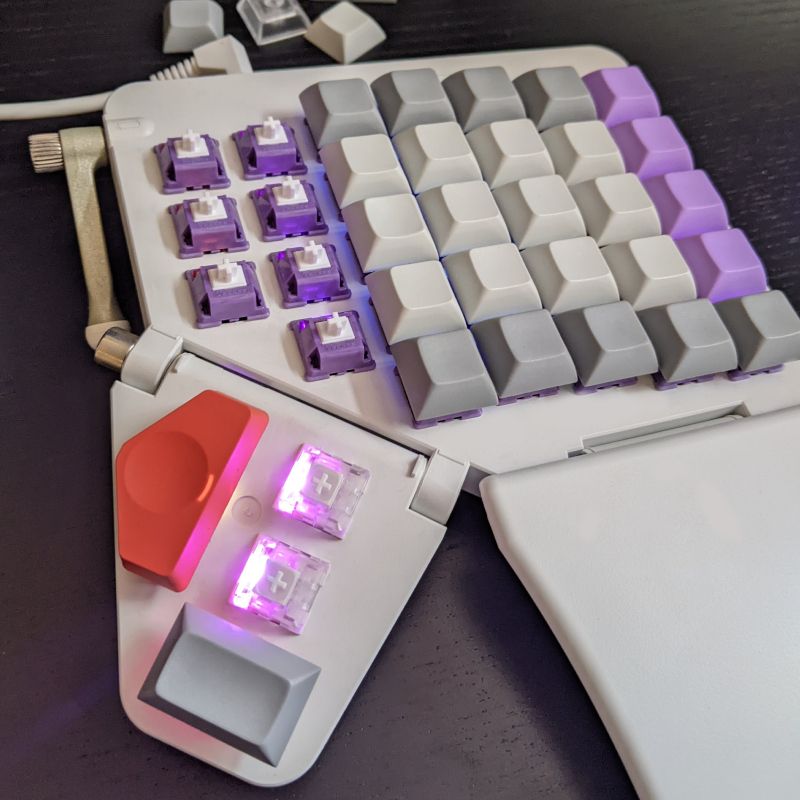My Moonlander is the white version, originally with Kailh Box Whites. I switched to TECSEE Purple Pandas recently for everything but the thumb keys. I love clicky tactile switches, if that wasn't already obvious, and those have a really nice feel while being a little quieter than the Whites. I actually started with a box shape switch because I was afraid there would be wobble due to the base OEM row 3 caps on a flat body, but I was happily surprised that wasn't the case, so I felt I had more freedom to experiment.