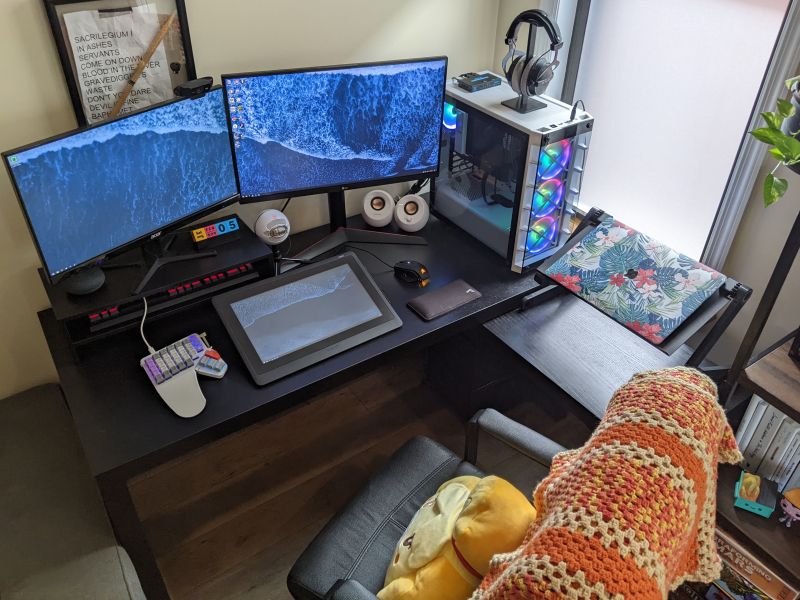 For fun, I'm on a Windows PC (and lucked out getting an RTX 2070 back in 2018 before the market exploded). I use Beyerdynamic DT 770 Pro headphones (80 ohm), a Wacom Cintiq 16, an Oculus Quest 1 with Link, and an Elgato HD60 S hooked up to a Nintendo Switch and HDMI splitter so I can swap between that, my PC, and my work laptop. My monitors have been swapped out ship-of-Theseus-style over the years, so those are a hodgepodge. Aligning the displays for a seamless wallpaper was a pain.