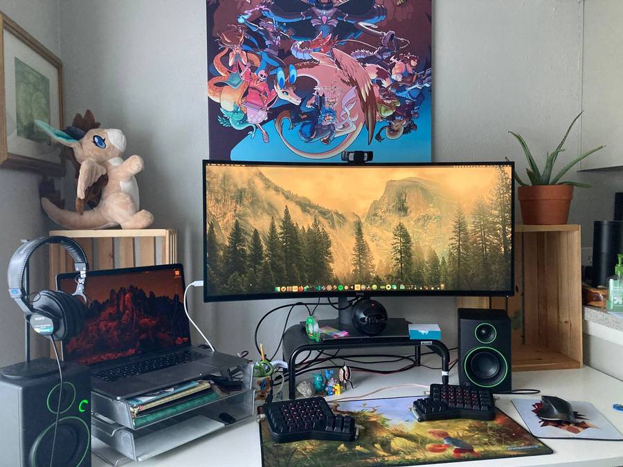 I recently made the jump into macOS! It's hooked up to a widescreen, curved Dell monitor. My mouse is an MX Master by Logitech. I have an IKEA standing desk, with a Herman Miller chair.