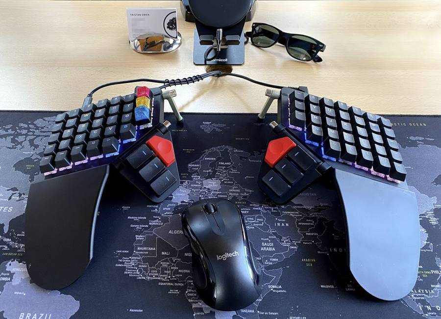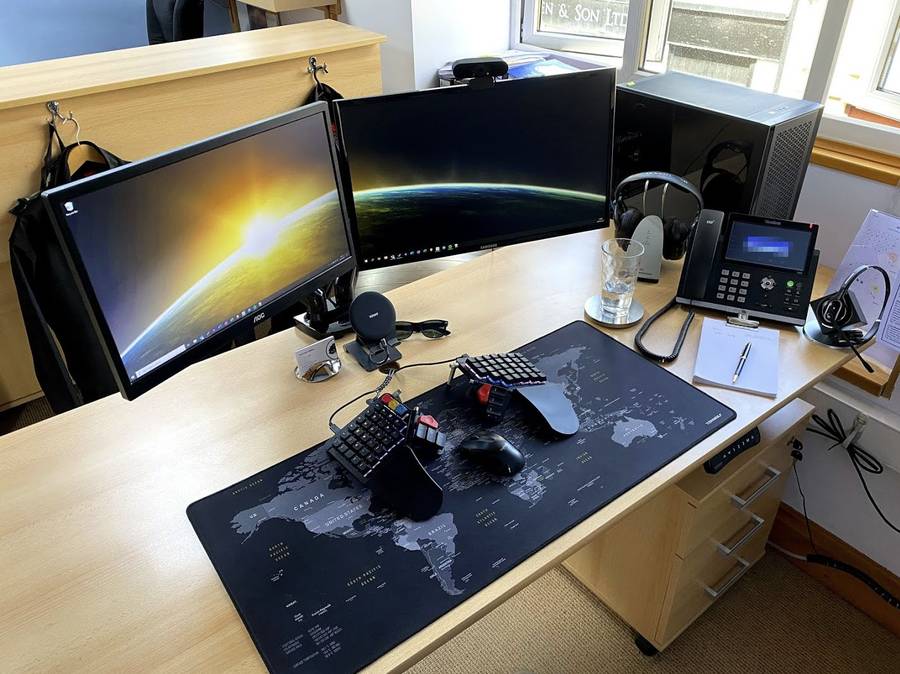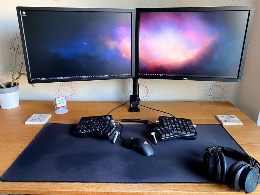 I have two desktop builds, one at work and one at home. Both are dual-screen setups with a split keyboard, a big mousepad, and centred mouse.