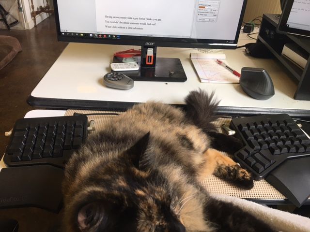 I use the ErgoDox EZ with a decent space between the two sides because it gives a place for my cat to lie that isn't on my keyboard. I use the sculpted keys with a modified Dvorak layout. I have programmed the layout to optimize for some of the things I use a lot in fiction writing such as italics, em dash, quotes, ?, and comments. I have a layer for Word that after programming the shortcut keys into Word allows me quick access to my most used Review pane keys making my runs through my edits much faster.