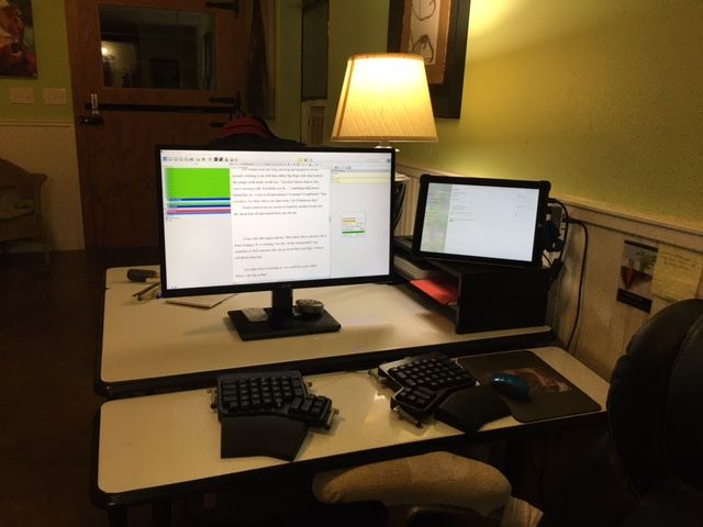 For hardware, I am pretty basic. I have a 24-inch Acer TV as a primary screen, and use the screen on my Microsoft Surface Pro as my secondary. I have an old Mac Mini that I use exclusively for the Vellum program that I use to format my books. For my keyboard, I use the ErgoDox EZ. My desk is a 1950s-era kitchen table. I partially extend one of the pullout leaves, which puts the keyboard at a nice sloping angle for my wrists.