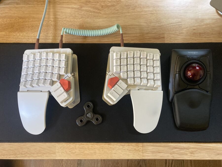 My keyboard layout is a pretty standard Colemak setup with an asymmetrical spacebar. I tried to make it as universal between Mac and Windows as I possibly could, but even still I had to make a QWERTY layer so that I could play games more easily. I don't have any custom caps on my Moonlander, but I'm really digging my custom cables! As for my ErgoDox, I spiffed it up with some keycaps from Pimp My Keyboard to make it more QWERTY-friendly.