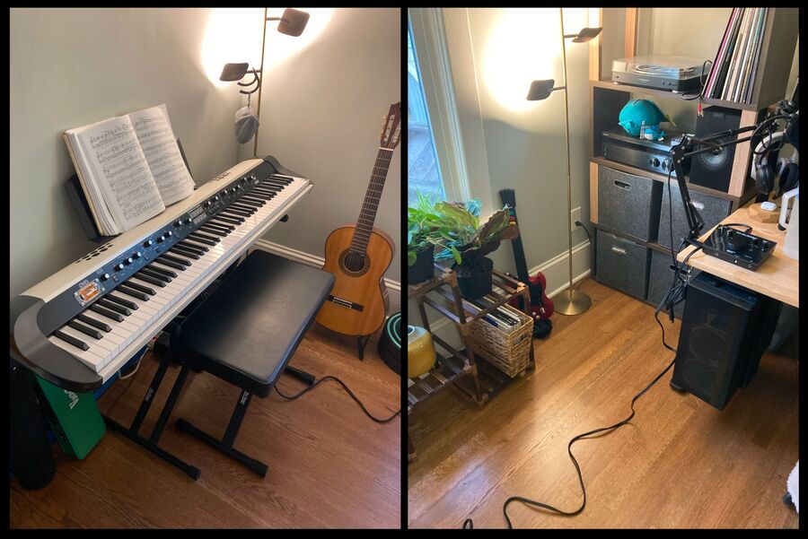 I would love to have a sit/stand desk that could accommodate my music keyboard (currently my beautiful Korg SV2) and some beefy monitors (for both screen monitors and sound monitors). The main goal is to have it always hooked up to my interface to prevent long, unsightly cables from running across the room. I'd also like an ergonomic chair that I could use at a standing height; this is very much a First World problem, but waiting the two seconds to go from sitting to standing simply does not fit in my schedule.