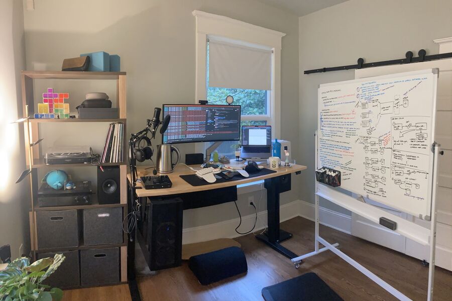 For work I have my 14" M1 Macbook Pro and for play I have my PC (an ATX mid tower) which touts 16GB of DDR4 3200 RAM, an AMD Ryzen 5, and an EVGA GeForce RTX 2070. I know, I know, it's a little dated now, but back in 2020 I was super happy to have all of this 😍. Both machines have a KVM that can make use of the following: an LG 34" Ultragear on a Loctek VESA mount, a Sony STRDH190 receiver leading to two KEF Q150 bookshelf speakers, a Logitech webcam, and a Kensington Expert Mouse.