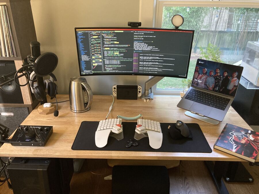 I feel like I forgot something… oh, my Moonlander! I have a Moonlander with custom cables from Mechcables (which I highly recommend for their quality and customer service!) and the platform. I used to work with an ErgoDox, but just had to nab a Moonlander once I saw the feature set. No regrets; this thing works like a dream.