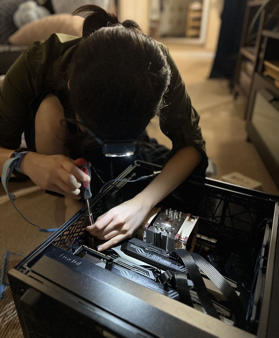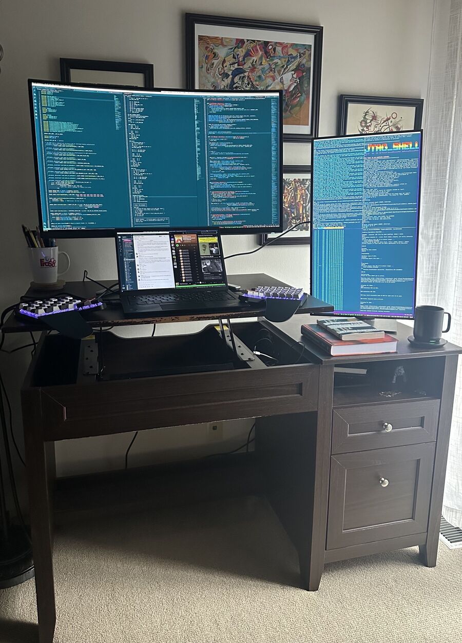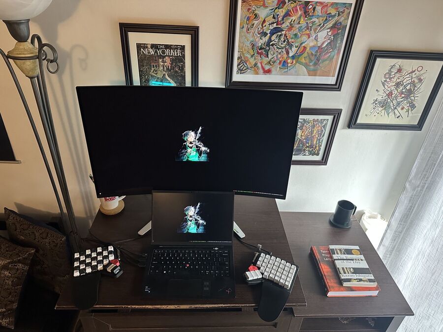 Waking up every day to the prospect of using my Moonlander is so exciting that I keep one at my office and another at home, of different colors. To the joint dismay of everyone in my life, I recently and completely superfluously purchased a curved Alienware 32 4K OLED monitor which I now use at home, occasionally with a vertical Dell UltraSharp 27 QHD on the side. Most of the time, the machine ends up being the ThinkPad X1 I requested for work, though sometimes it is my personal Dell XPS 13 (my next laptop purchase will absolutely be a ThinkPad), or the Lego project downstairs that I spec’d out with a Threadripper, dual RTX 3090s + NVLink, and an obscene quantity of RAM and NVMe, to remain undisclosed. I also bought her a Noctua fan.