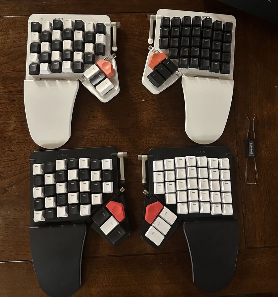 I just use the default blank keycaps on both Moonlanders. For aesthetic reasons, I've fully swapped the caps between my two boards on the right half, and half-swapped them in a checkerboard pattern on the left. As cool as tenting looks, my hands work better with the thumb clusters tilted up and infrequently used functionality mapped to the red keys. There are a few other keys like the bottom-row pinky that I generally don't map important keys to because I find them hard to reach. My layout includes an unreachable reference layer color-coded by difficulty to reach on one side, and relative actuation force bucket on the other (inversely correlated with reachability). Unsurprisingly, the set of most reachable keys looks a lot like a Voyager.