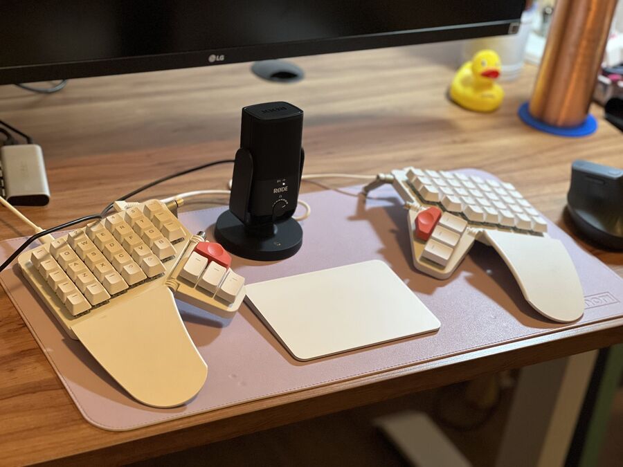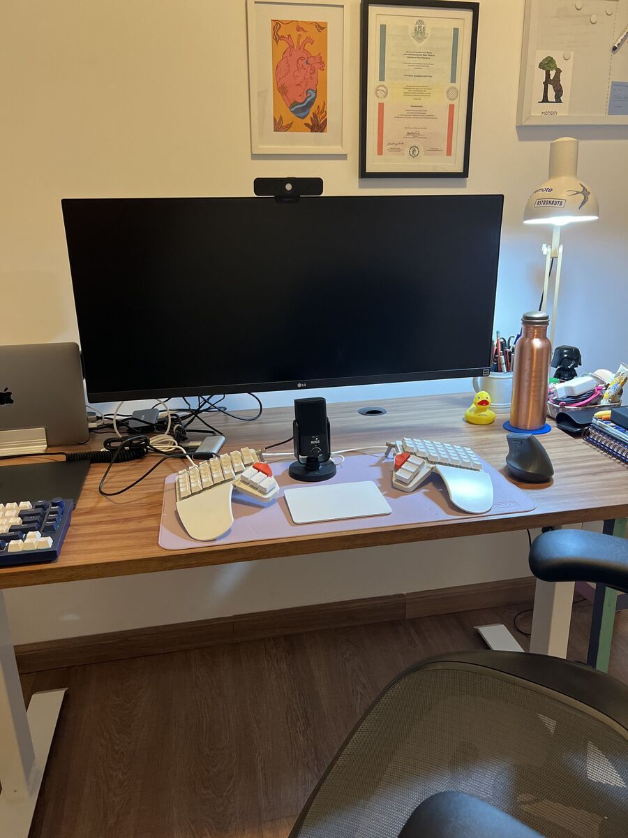 I work on a MacBook, and I have a set of peripherals to help me have an ergonomic setup, which has been very important for me lately. From chair to a standing desk, to the Logitech MX Vertical and sometimes an Apple trackpad as well. Also a wider monitor helps me a lot (mine is a simple wide-screen one from LG) and a RØDE mic for a more improved sound quality. Also the Moonlander as main keyboard, but also I have a regular mechanical keyboard that I use for unrelated-to-work stuff.