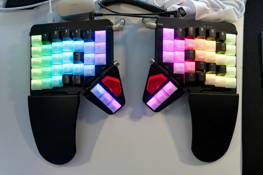 I have a Moonlander. I’ve replaced the original Cherry Brown switches with Kailh Pro Burgundy switches. They’re wonderful to type on, relatively quiet, and easy on the fingers. For keycaps, I’m using some of the original black keycaps, but I’ve replaced most of them with plain white translucent keycaps. I used to have a problem with looking at my hands when typing, and removing most visible symbols has helped me cut that out.