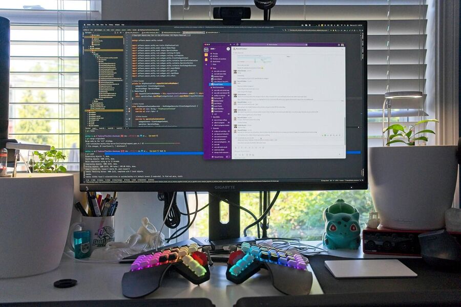 For work, I use a 16” MacBook Pro. For my own amusement, I have a gaming PC that I put together. They’re both connected to a Gigabyte M32U monitor that acts as a KVM switch. I use a Magic Trackpad with the Mac and a Logitech MX Vertical Advanced Ergonomic Mouse with my PC. My desk is a hand-cranked standing desk from Ikea, and I sit in a Herman Miller Aeron chair.