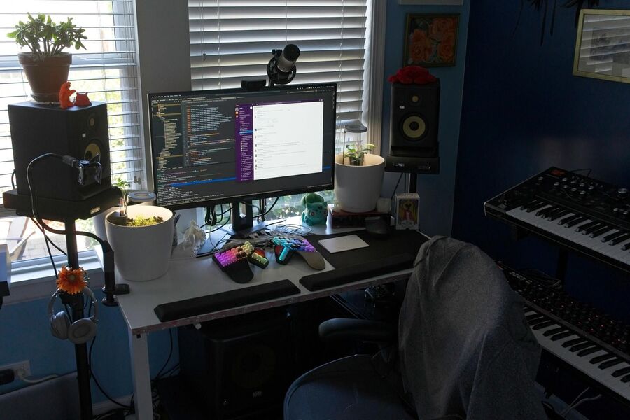 I kind of already have my dream setup. Every day, I get to look out my back window into a quiet alley filled with greenery, birds, and squirrels, and I love them. I have just enough space on my desk for a few plants, and I love them. My synths are always right next to me and ready to be played, and I love them. My Moonlander is a pleasure to type on, and I love it.